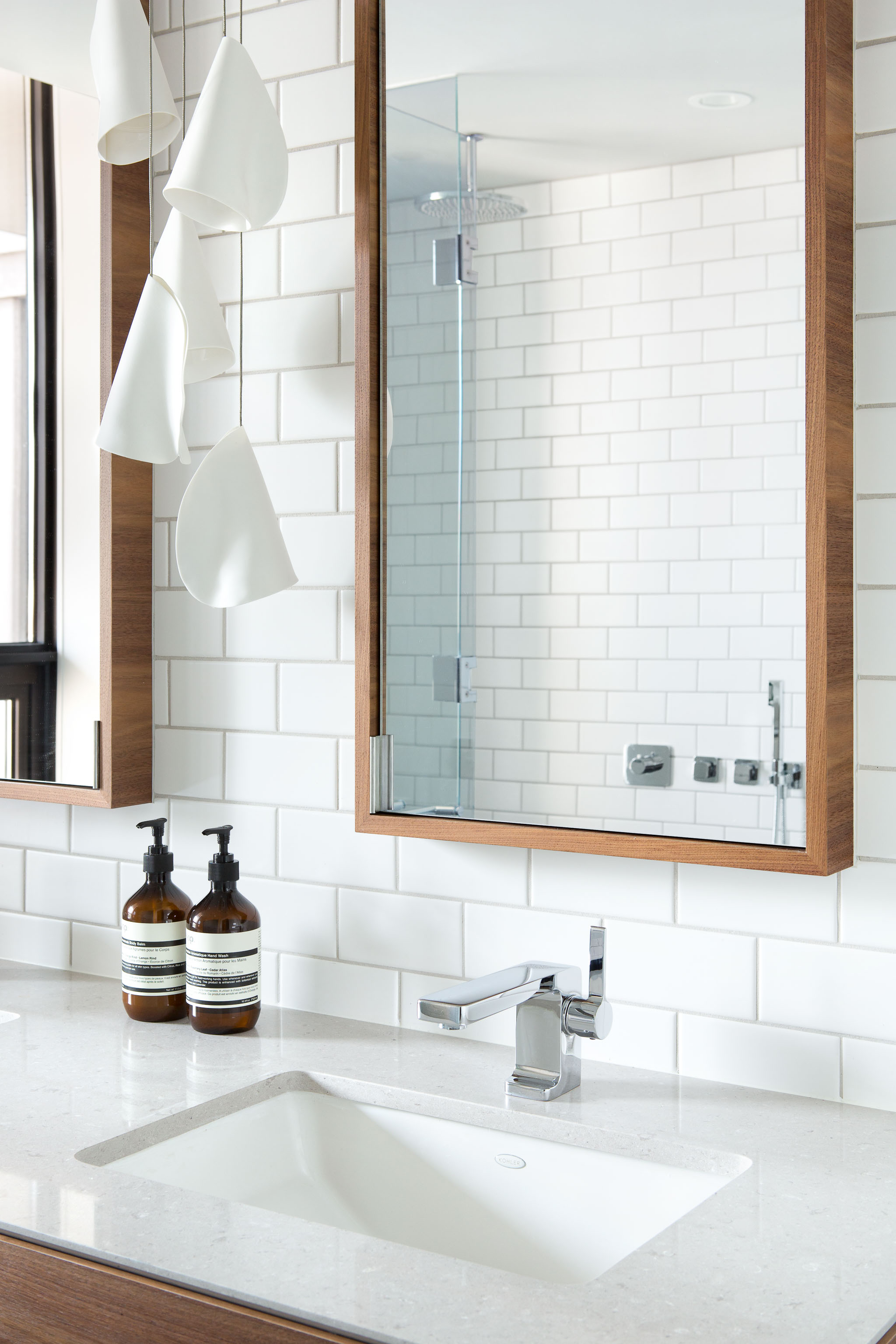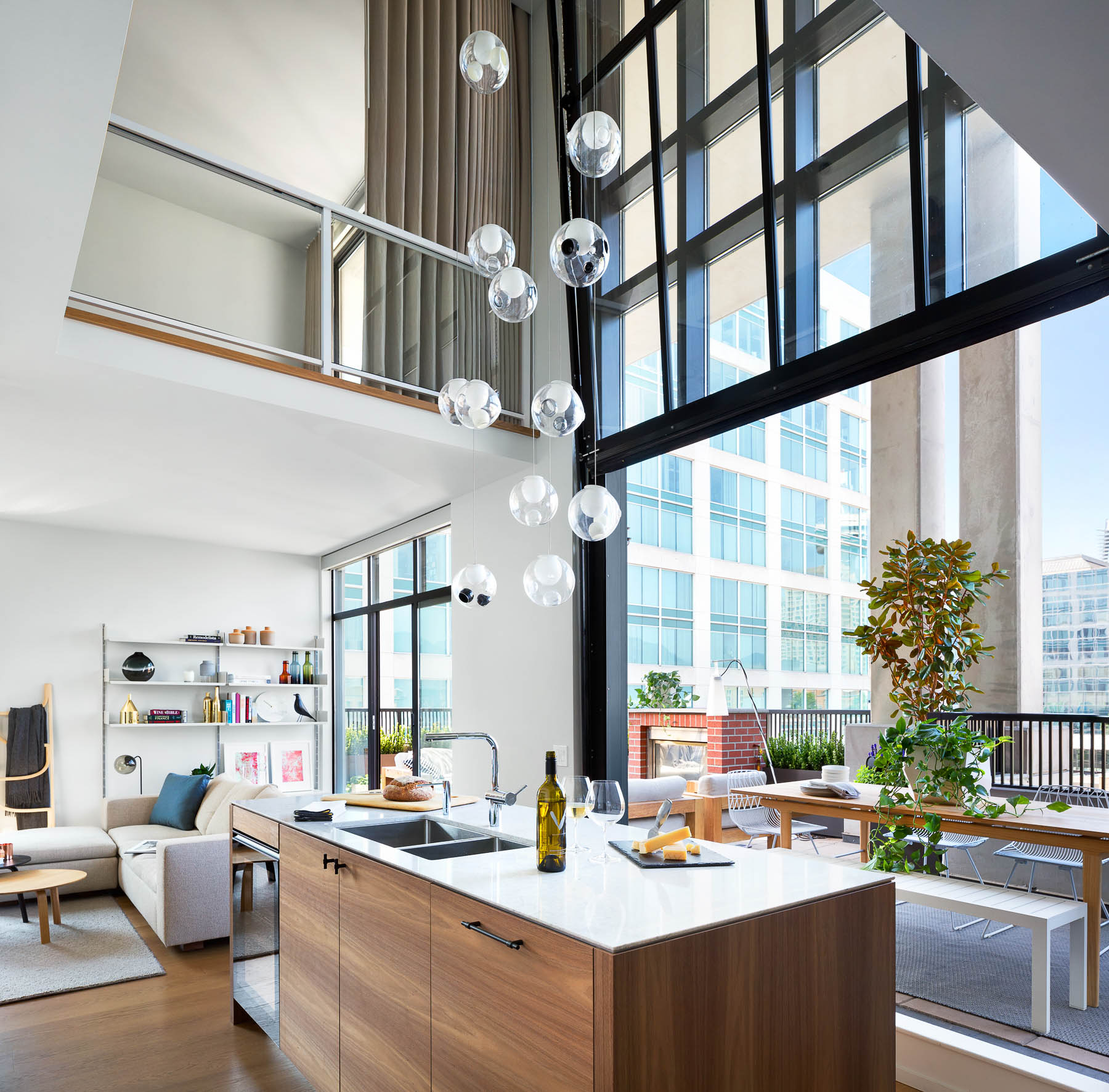 "The Brooklyn-inspired look is perfect for the couple's lifestyle. Robust quartz countertops, black hardware and mid-century lamps create a sense of modern ruggedness."