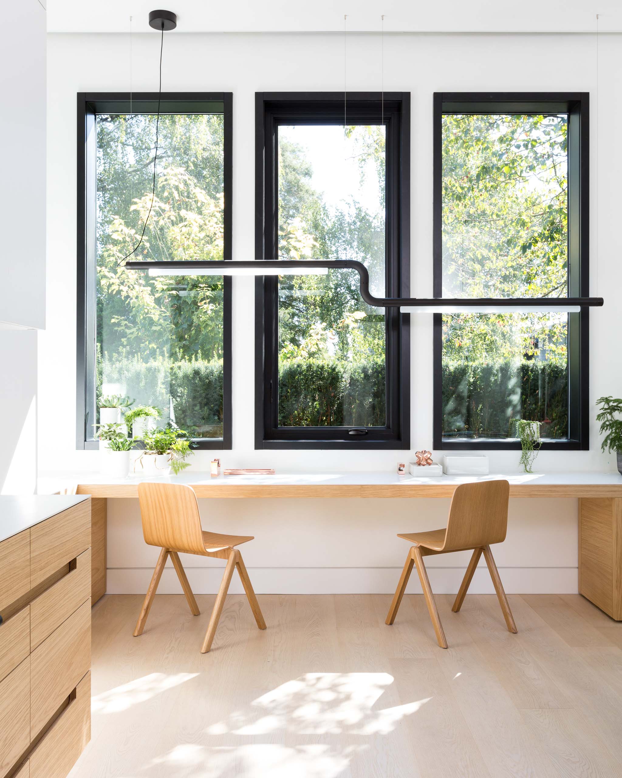 The design of this house revolves around family togetherness, throughout the whole house: the kitchen’s worktable island forms the central gathering place, along with an ample sized mudroom, and sizable study with multiple work areas.